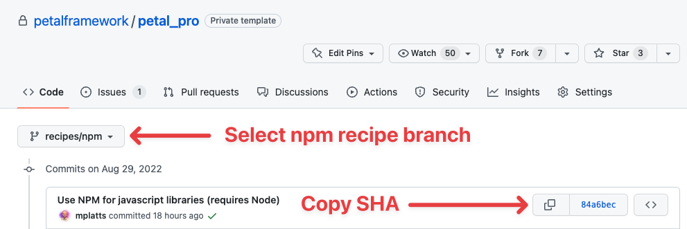 Then select the recipe branch, and copy the SHA of the latest commit on that branch.