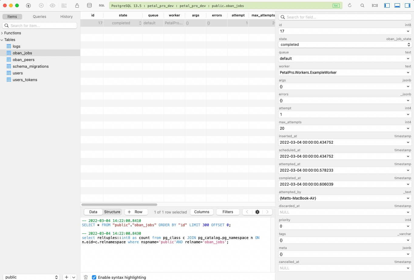 Oban.insert(PetalPro.Workers.ExampleWorker.new(%{}))Once in the database, Oban will try running the task and retry it if it fails. You can see any failed jobs by checking the database: