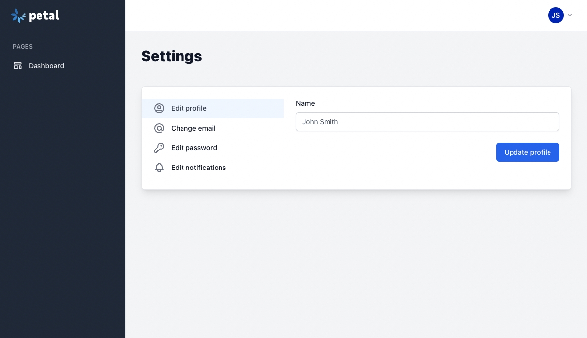 Petal Pro provides a number of layouts: "sidebar", "stacked" and "public". These are quite configurable however you may want to modify them. To do so, you can simply edit or duplicate the layout file in the following path: