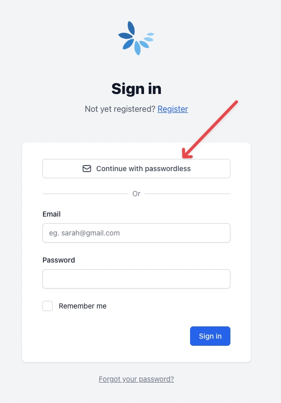 config :petal_pro, :passwordless_enabled, trueWhen it's enabled, a "Continue with passwordless" button will show up on the sign-in and register pages: