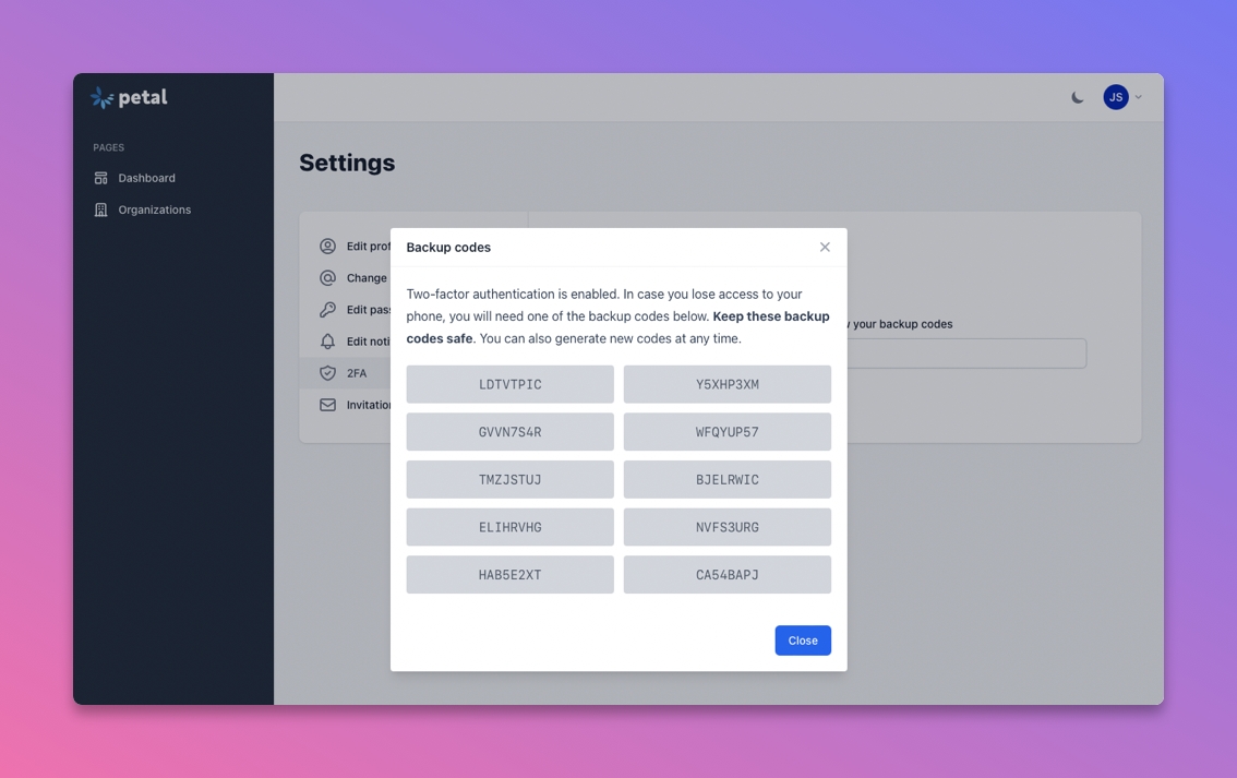 Once set up the user will also be provided with some backup codes (in case they lose their phone).