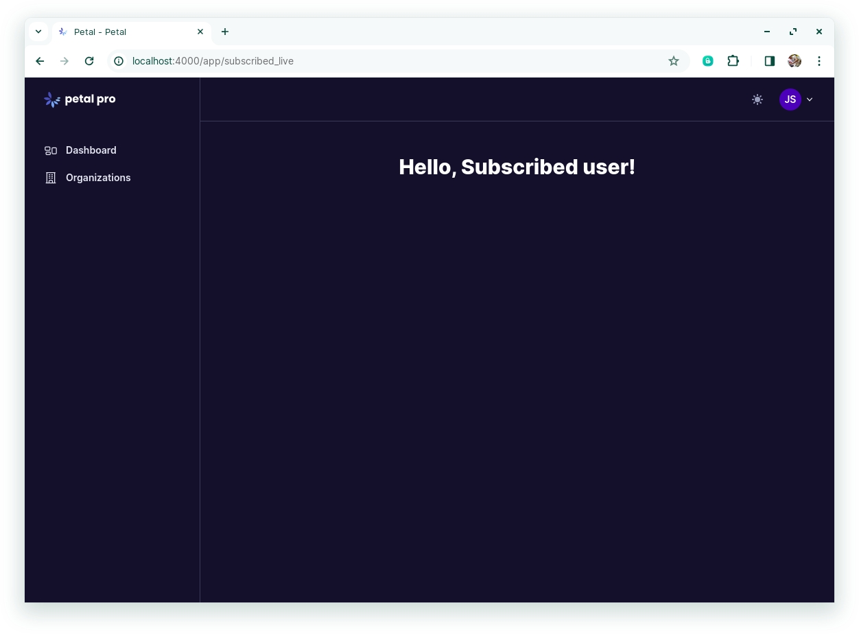 /app/subscribed_liveFinally, the last thing to be aware of is lib/petal_pro_web/routes/subscription_routes.ex. There are two locations in this file where you can add new routes for subscribed users: