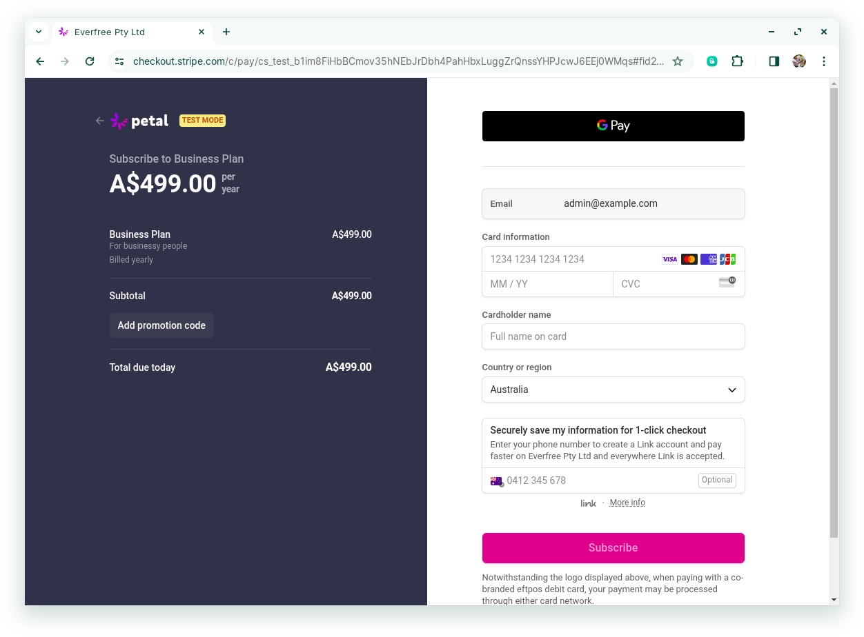 Because Stripe is in test mode, you can use the test card 4242 4242 4242 4242. Fill out the details and hit the Subscribe button.