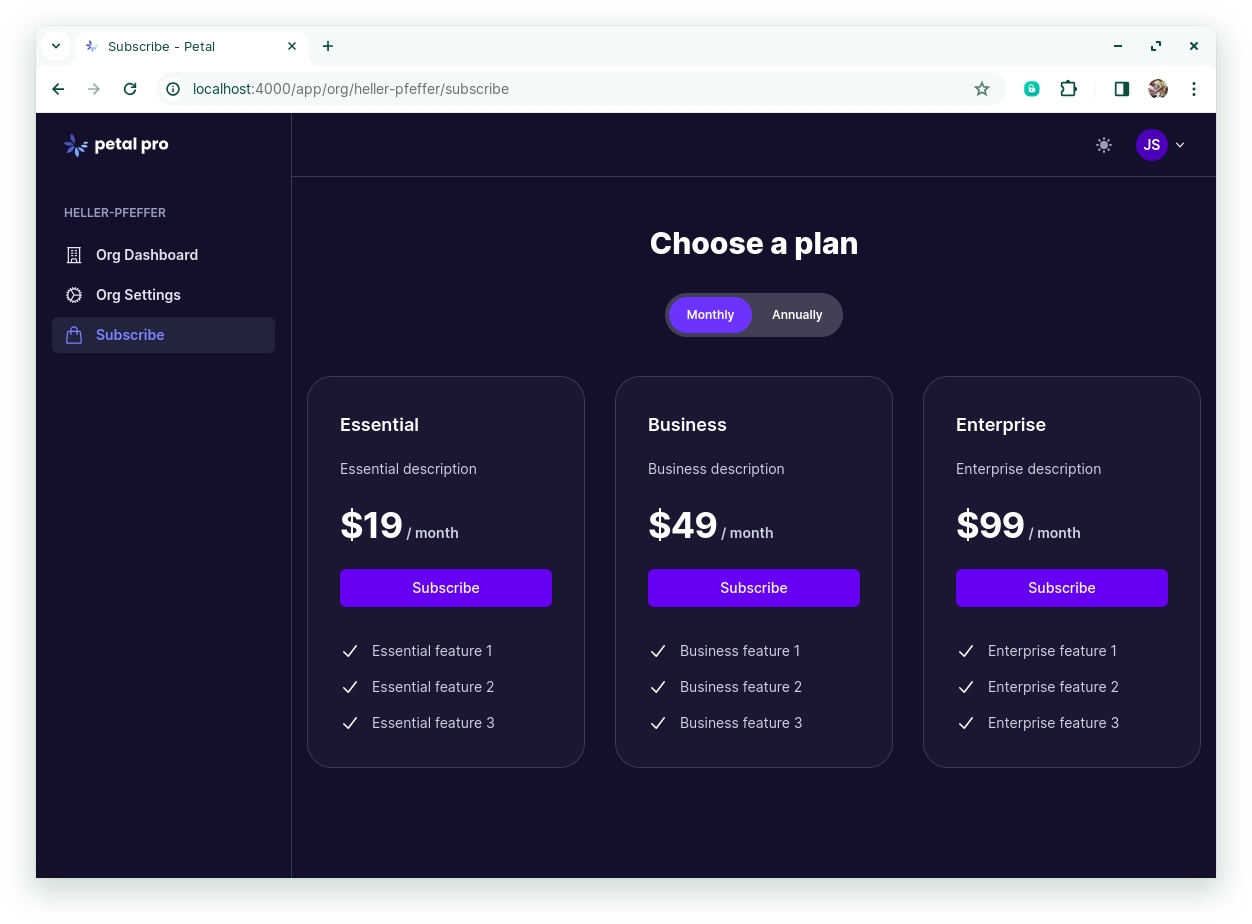 config :petal_pro, :billing_entity, :orgFor org-based subscriptions, the following routes are relevant: